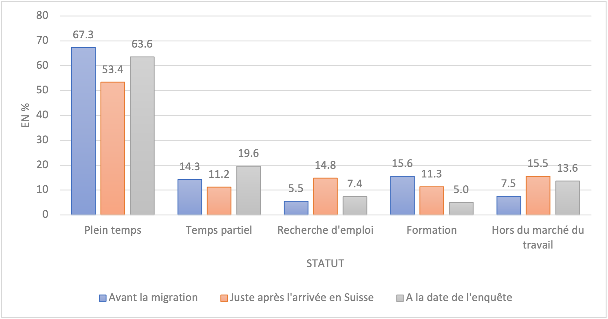 Avant de venir en Suisse, 67,3 % des personnes interrogées ont un emploi à temps plein et 14.3 % au moins une activité à temps partiel. Juste après l’arrivée en Suisse, un phénomène d’adaptation s’observe, qui conduit à une diminution de la proportion de personnes travaillant à temps plein (53,4 %). Au moment de l’enquête, soit quelques années après l’arrivée, les emplois à temps plein concernent 63,6 % des personnes interrogées. La proportion des personnes en temps partiel atteint 19,6 %, une augmentation de 5,3 % par rapport à la situation précédant la migration. Au total, la proportion d’actif·ve·s occupé·e·s reste constante avant la migration et après, mais le temps partiel est plus fréquent.