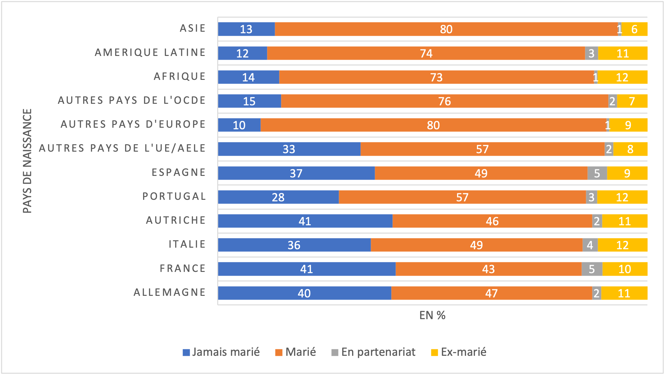 Néanmoins, il existe des disparités en fonction du lieu d’origine. Par exemple 79,9 % de la population étrangère originaire d’Asie (incluant l’Océanie) est mariée contre moins de 50% pour les ressortissant-e-s des pays voisins. Plus de 40% des Allemand-e-s, Français-e-s et Autrichien-ne-s s n’ont jamais été marié·e·s, alors que cette proportion ne dépasse pas 15% parmi les Latino-américain-e-s, Africain-ne-s et Asiatiques. Ces différences peuvent être expliquées par les dispositions relatives aux permis de séjour – pour les personnes originaires de pays dits tiers, le regroupement familial est le motif d’immigration le plus fréquent – ainsi que par la perspective culturelle entrainant une signification différente du mariage selon l’origine.